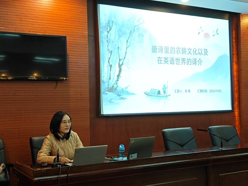第三场讲座于11 月 5 日晚上 19:00 在龙泉 1213 会议室举行,邀请到四川农业大学副教授张梅,以《唐诗里的农耕文化以及在英语世界的译介》为主题展开分享。张梅副教授从唐诗中农耕文化的内涵解读入手,探析唐诗所承载的中国传统农耕文明的精神内核。随后,她聚焦农耕诗在英语世界的译介实践,对比了不同译本的翻译策略与表达效果,为在场师生提供了文学翻译与跨文化传播的专业思考,进一步强化了大家对中华优秀传统文化国际表达的关注与探索。